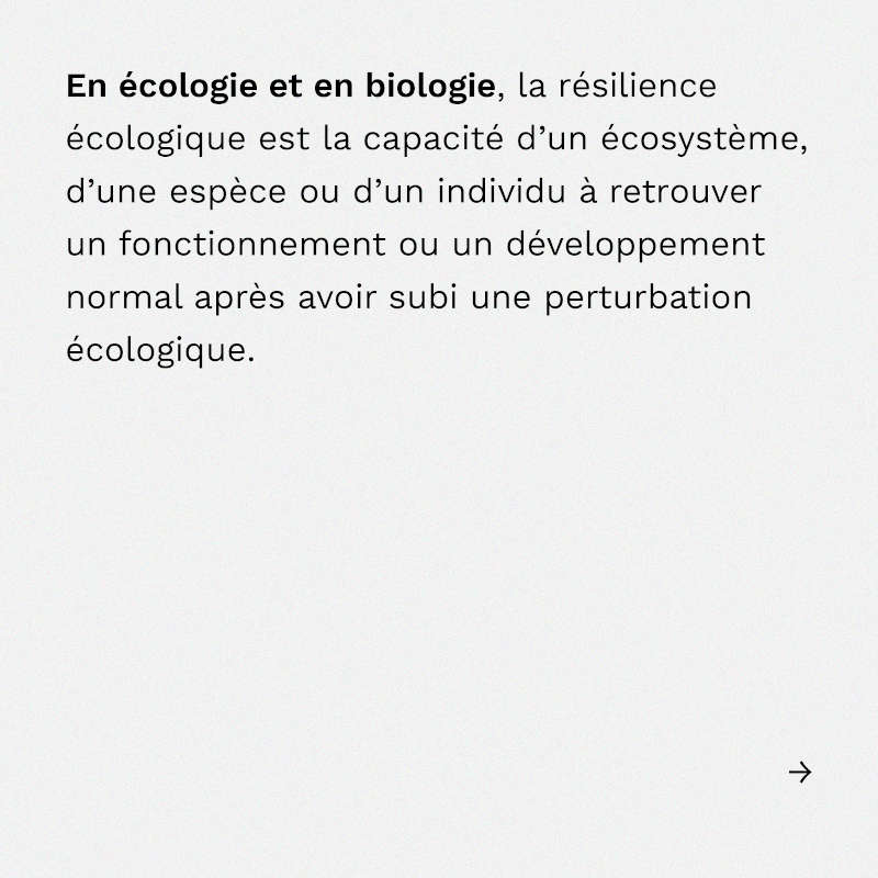 En écologie et en biologie, la résilience écologique est la capacité d’un écosystème, d’une espèce ou d’un individu à retrouver un fonctionnement ou un développement normal après avoir subi une perturbation écologique.