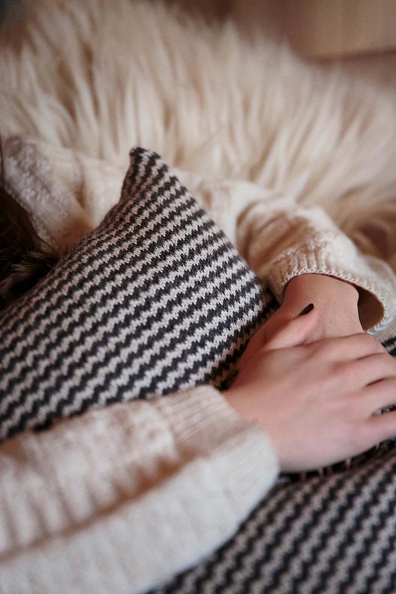 Coussin à motif navy avec des vagues, confectionné en Belgique. Artiste belge. Laine peignée écoresponsable wallonne de Mergelland, couleur blanc et anthracite. Lin européen certifié Oeko-Tex Standard 100 et Masters of linen. Cruelty-free